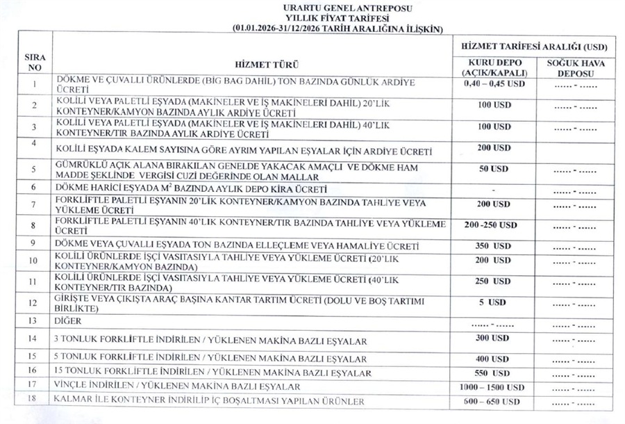 Genel Antrepoların Yıllık Fiyat Tarifeleri
